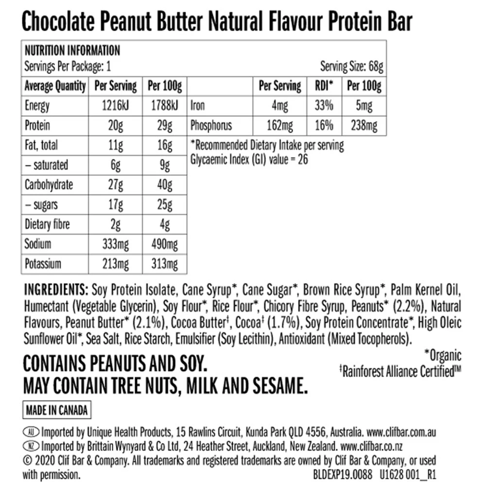 Devour the tasty Builders Chocolate Peanut Butter Protein Bar from Clif to help repair and build muscle straight after your energetic escapades.Â