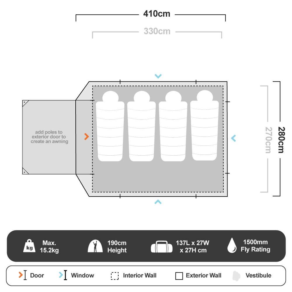 There is an additional zip on this tent above the awning for attaching a separately available EVO shade awning which can also connect to an additional 3x3m Coleman Lighted Instant Up Gazebo for more undercover space. Whether used on its own or with additional shade accessories, the Instant Up Silver Evo 6P from Coleman provides quick, easy, and versatile shelter for your weekends away.
