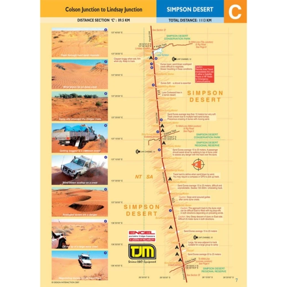 Made from heavier weight gloss paper than maps, the trip across the 1100 dunes of the Simpson Desert is laid out in a strip map format, meaning the focus is on the crossings, the campsites, and the specific information for each section of the track. Pictures are added alongside each section to aid preparation and recognition.