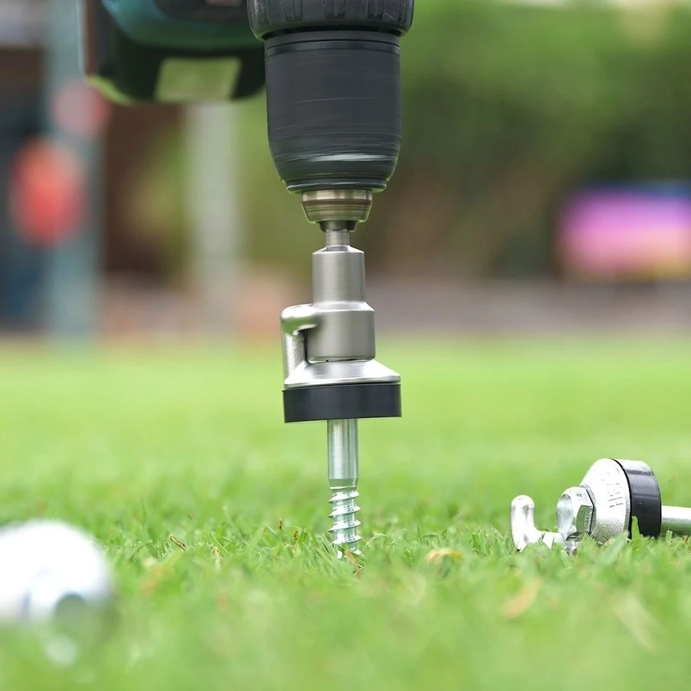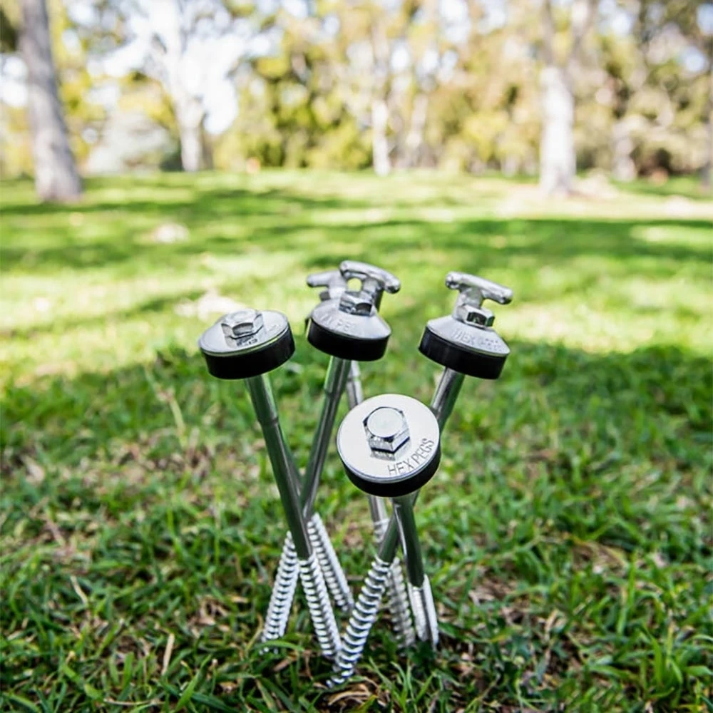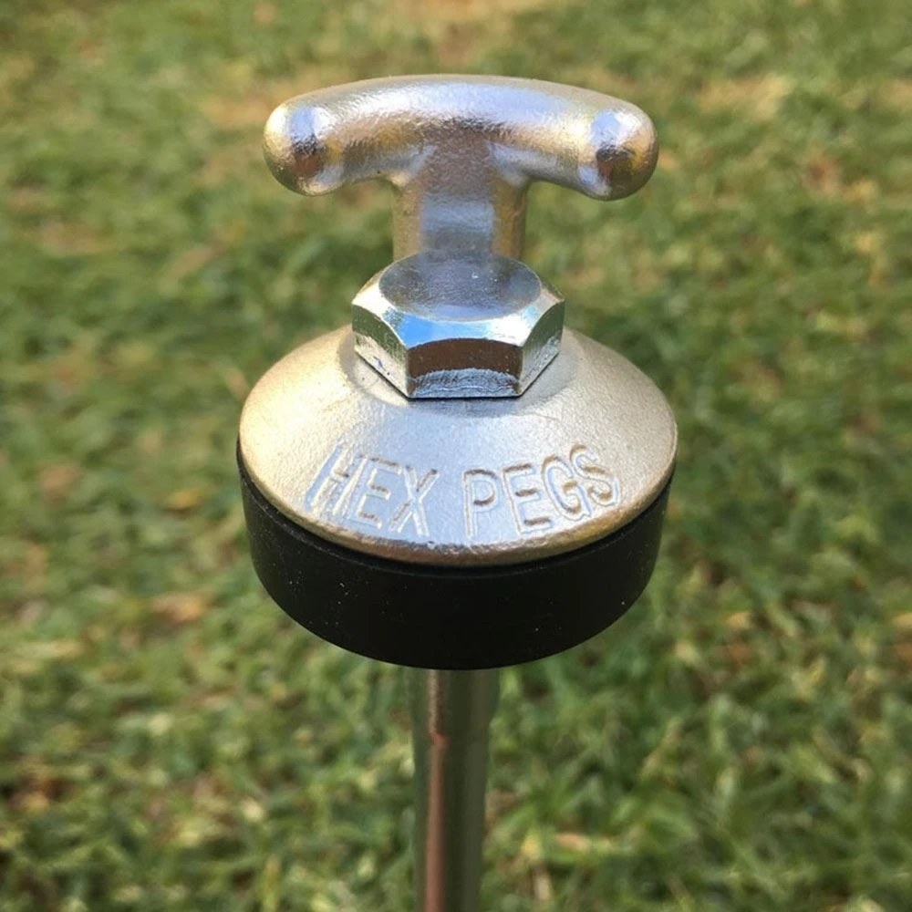 Hex pegs are unique in that they can be inserted and removed in just a couple of seconds with both electric and cordless drills and impact drivers thanks to the clever design. So, you can spend less time pitching and packing, and more time relaxing at the campsite. Each peg has a high-quality steel threaded body, a rubber grommet and stainless-steel washer with a hook attachment on top which can be drilled into almost all ground surfaces.Â