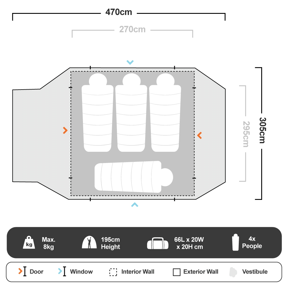 The Tasman 6V Dome Tent is ideal to be used in warmer climates, due to its breathable polyester inner while the windows are covered with No-See-Um mesh which will allow fresh air to come through the tent. When nature calls, you won’t have to worry about stumbling over in the dark, as the doors on the Tasman are a user-friendly D shape. The cross-pole configuration makes the Tasman easier to set up and will help prevent water from pooling and the fly has been treated with a silver coating which will reflect the heat while also added an extra element of protection in adverse weather.