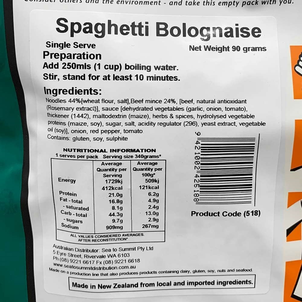 The Back Country Cuisine Spaghetti Bolognaise is comprised of tender beef mince with tomato in a savoury sauce served on a bed of noodles for a hearty meal on a lightweight adventure.